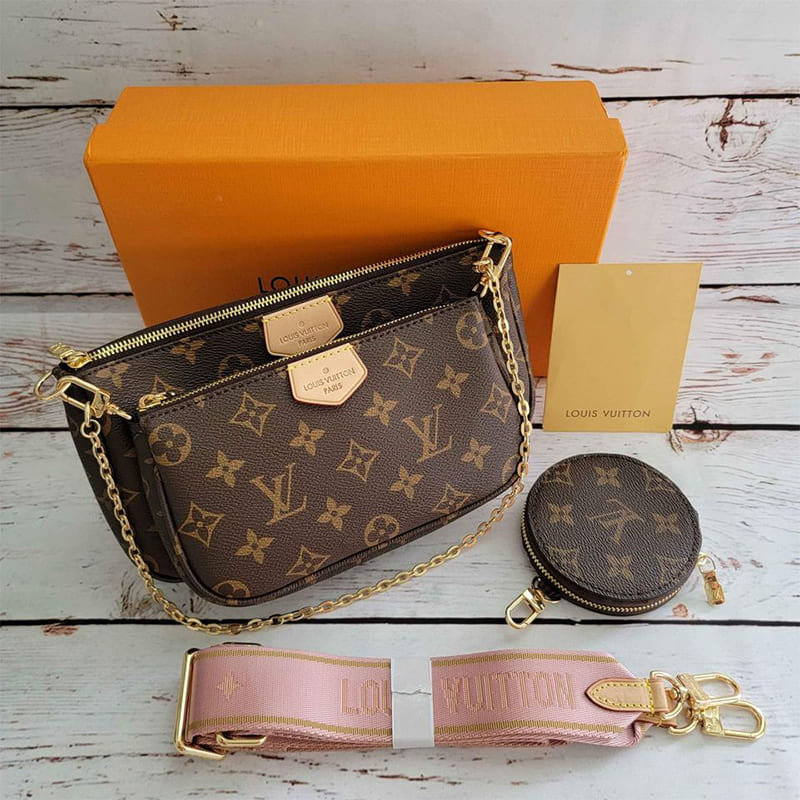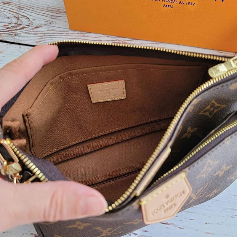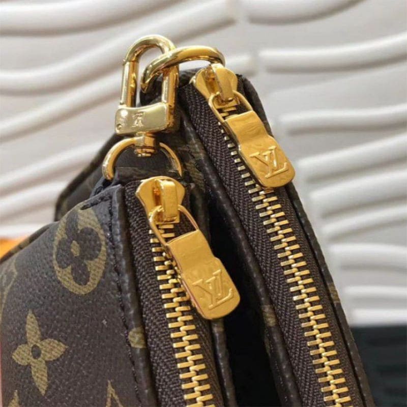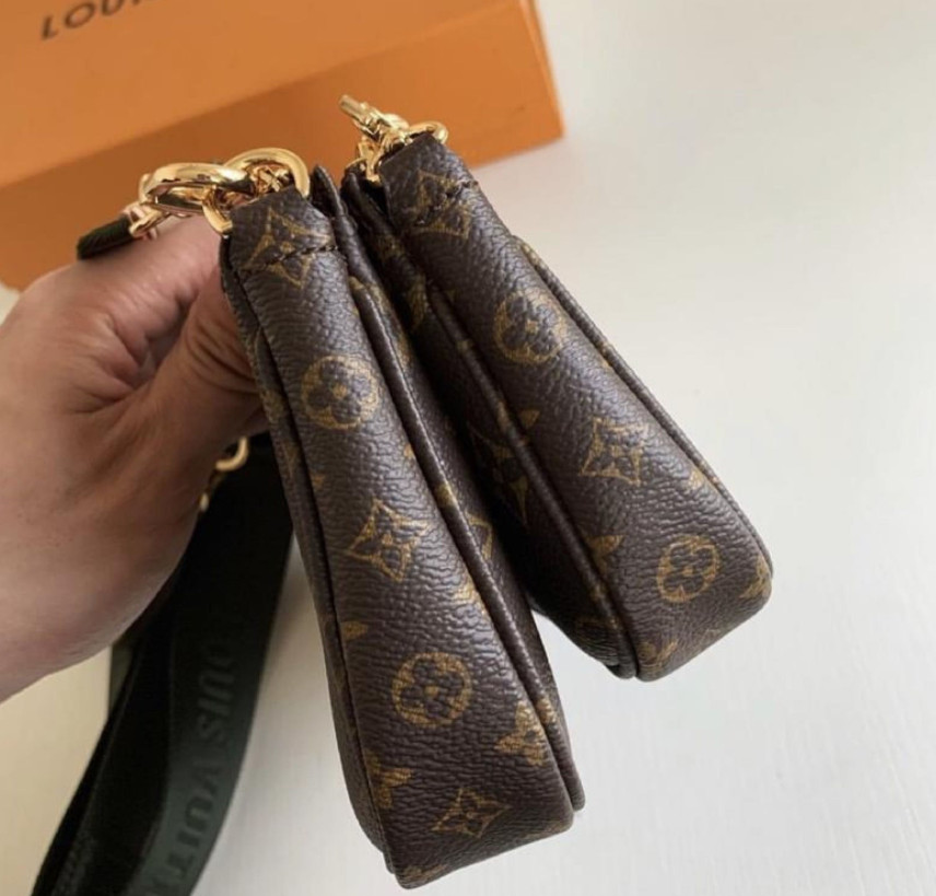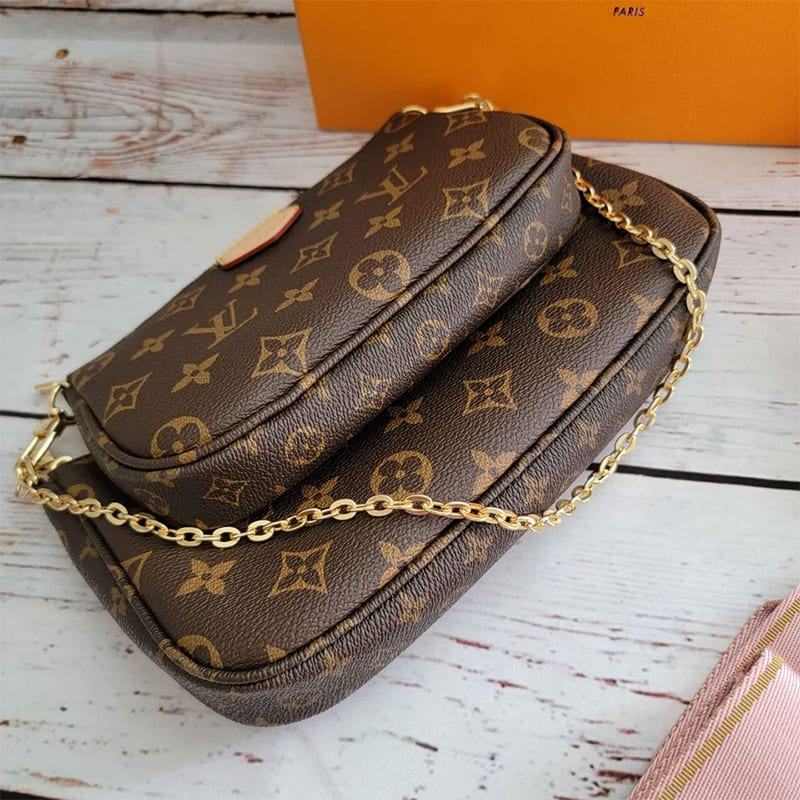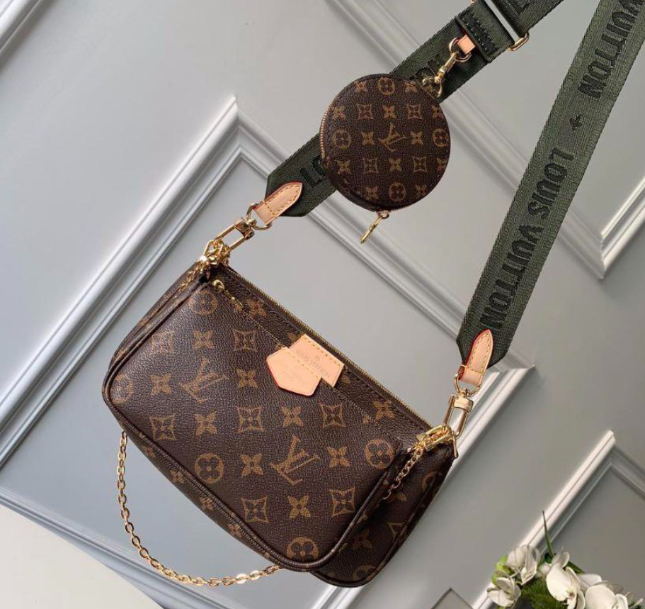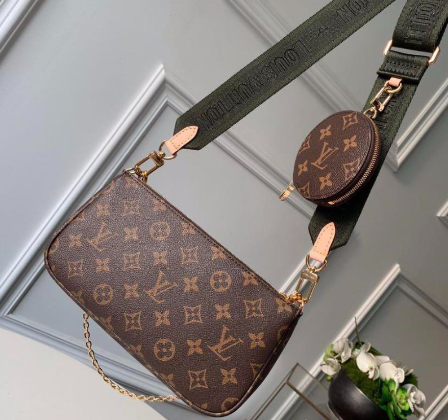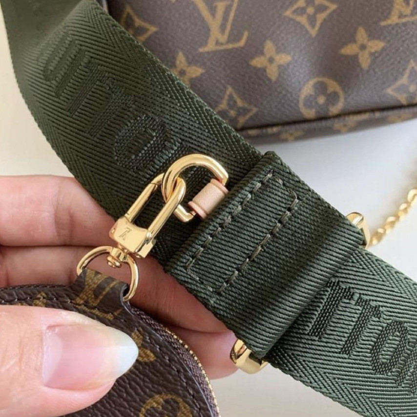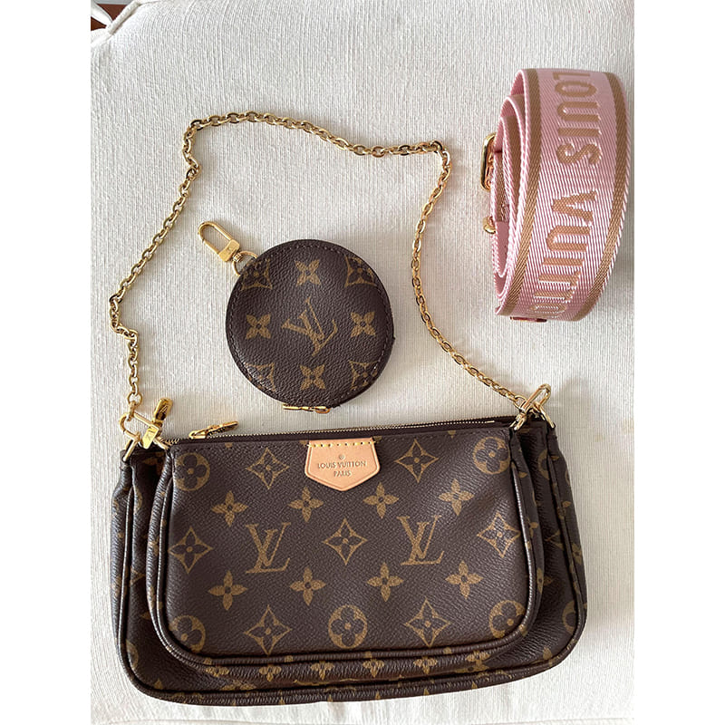 The Multi Pochette Accessoires is a hybrid crossbody bag with multiple pockets and compartments that brings together a Pochette Accessoires, a Mini Pochette Accessoires and a Round Coin Purse. Fashioned from Monogram canvas with a mini Monogram pattern on the sides of the two pockets, it has both a removable goldtone chain and an adjustable inscribed Jacquard strap for multiple carrying options.
